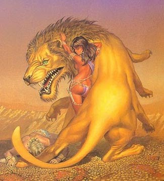 Um. Hello? Who are all the eight-legged lions eating when our hero and heroine aren’t traipsing by in chain-mail lingerie?