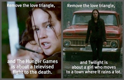 I’ve included the funny poster comparing Twilight and Hunger Games. Of course, even if it were true, finding love is just as high a stake, sometimes higher, as your life, so there’s nothing wrong with a story that is “only” a romance.