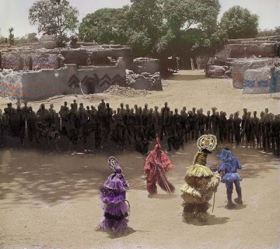 The dancing societies of Faearth are inspired by shamanistic dancing societies found in a number of different societies. I lived for a year in Cameroon, West Africa, (first in Batie then in Bamenda, for those handful of you who know Cameroon), and had the opportunity to watch the dancing of a group of shamans from a secret societies. It was fantastic. They wore costumes made in the traditional way, for the purposes of the sacred ritual.